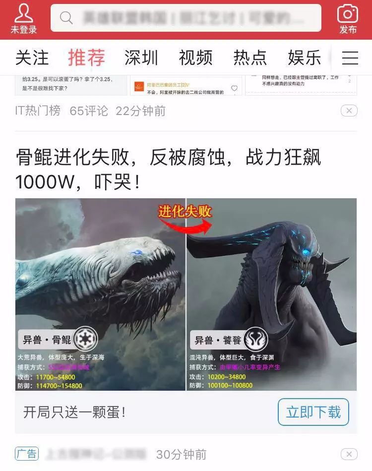 打开某头条app,在浏览过程中,会发现大多都是这种游戏广告,猎奇的图片加文案就是一个个鲜活的段子,成功吸引了不少网友。