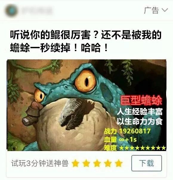 01、电脑上,最热门的当属“我系渣渣辉”的传奇页游广告,一度成为网友们的槽点。而近来手机上的游戏广告同样走上一条奇葩的道路。巨鲲,俨然开始成为新潮。