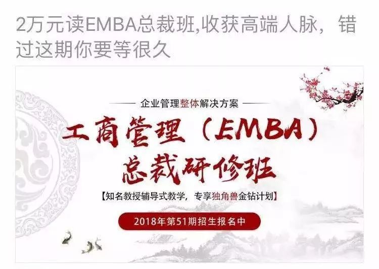 文案前奏便突出课程价格,极大程度控制了垃圾流量,另一方面以“收获高端人脉”为痛点,吸引用户点击。它并没有像所有信息流广告以实景为素材,而是以一张宣传图为背景素材,整体视觉效果较好。