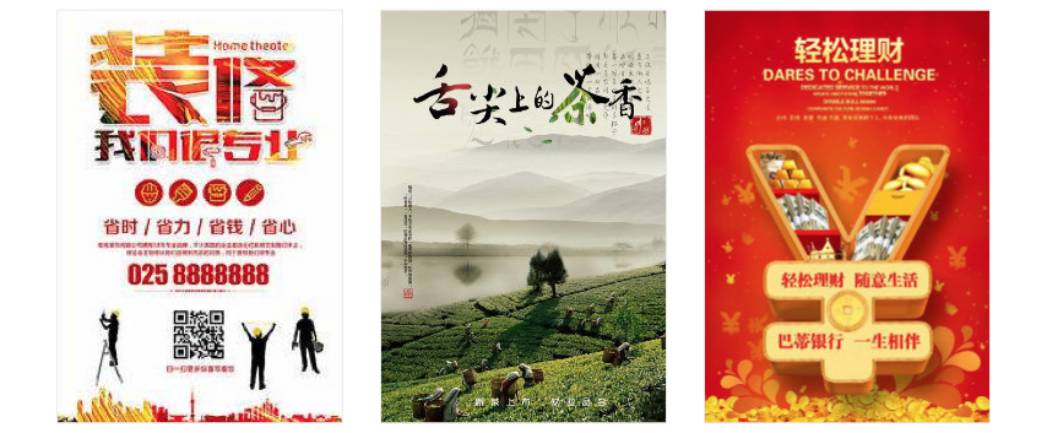 左一:引导行为(扫码或拨打电话),中、右:唤起情绪(茶香、赚钱)