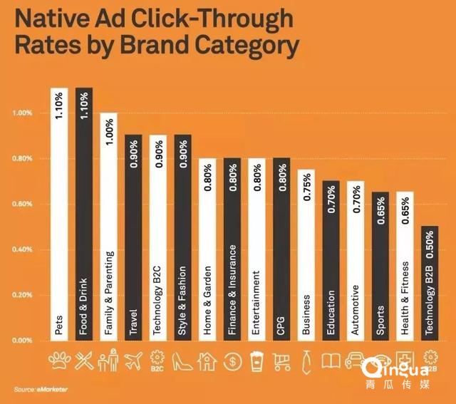 eMarketer 数据显示:原生广告的点击率十分可观,其中宠物、食品、饮料、交通出行类广告的点击率较为领先,达 1% 左右;此外,巨量引擎发布的《人群精细化定向下的广告价值评估白皮书》还显示:行业性质不同,信息流广告点击率差异也较大。建筑房产类、IT 产品类、旅游出行类、食品饮料类广告点击率较高,一般在 2% 左右;教育文化类、母婴用品类由于垂直属性较强,信息流广告点击率相对较低,在 1% 左右;另纵观美数每日高达 16 亿广告请求的数据分析,其信息流广告的点击率也一般保持在 1-3% 左右。