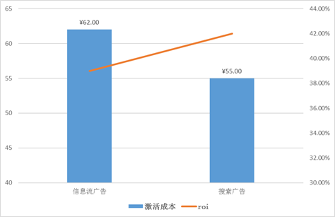 数据显示,搜索广告对于搜索广告激活成本下降12%,roi提升7%;但是广告触发形式的限制,搜索广告日消费较少。同等出价下,搜索广告的花费仅是信息流广告花费的10%。