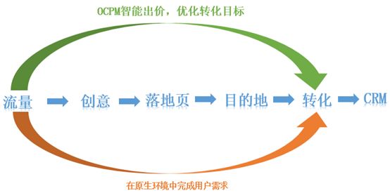 一个完整的投放过程我们可以用以下几个节点进行划分:即流量(资源位)→创意→落地→目的地(App/小程序/电商店铺等)→转化(满足用户需求/变现)→CRM。