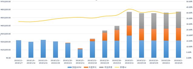 下图是我从2019.1月开始测试有效获客及深度转化的效果图,可以看到随着时间推移,这两种投放方式随着预算占比增大,效果开始有明显提升。