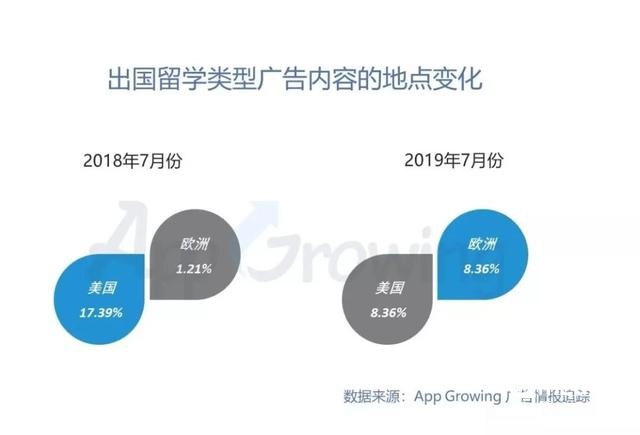 在App Growing所追踪到的出国留学类广告中,对比2018年7月及2019年7月的广告数据,广告文案中提及“欧洲”有明显增加,受国际形势变化的大环境影响,市场青睐的留学国家也在发生改变,这也体现在了广告投放内容之中。