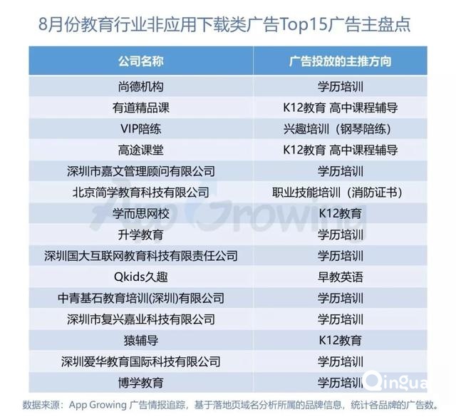 1、8月非应用下载类广告重点广告主盘点,主推学历培训的广告主占比高