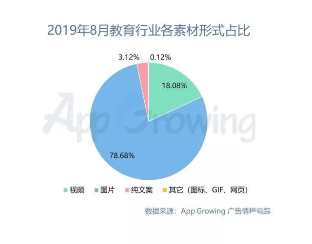 在我们所追踪到的8月教育培训广告中,教育行业素材形式整体以图片为主,视频广告占比近两成,近几个月这一形式占比呈上升趋势,可见教育行业也开始更加注重视频广告这一广告形式。