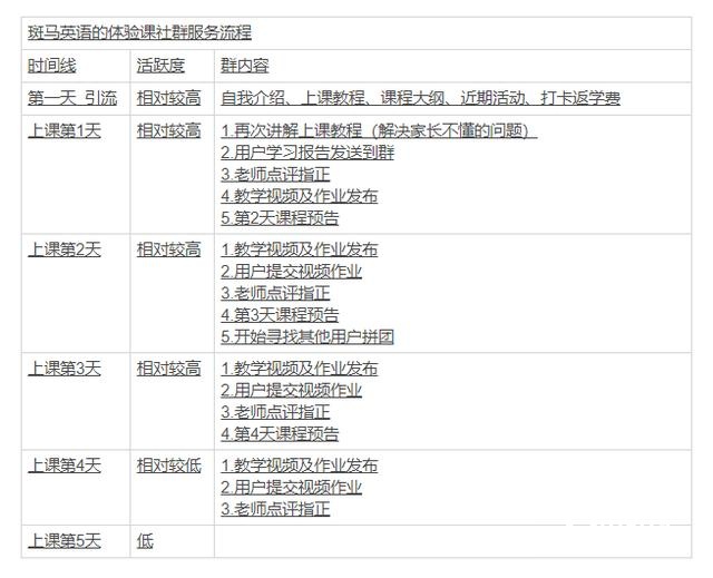 在微信群的管理中,「斑马英语」的精细化运营做得很完善,班主任几乎全天都能及时回家长群的消息。分享一份斑马的运营流程表: