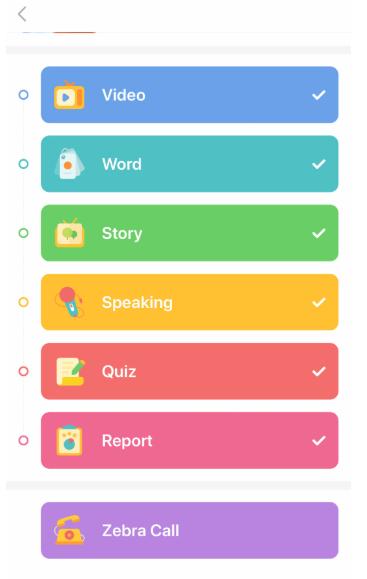其中孩子们的学习环节设计这一块,「斑马英语」花费了很多心思去打磨,将时间控制恰到好处的时间,一步一步的培养孩子的微习惯:外教视频(5min)+单词认读(2min)+绘本故事(2min)+口语练习(2min)+单词拼写(2min)+ Zebra call(AI伪外教视频通话,约2min)
