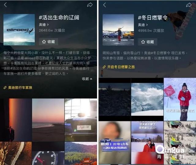 在奥迪官方抖音号发起的所有话题之中,最火的是#冬日燃擎令#和#活出生命的辽阔#。这两个都是展示奥迪带你去看风景,不管是玩转冰雪世界还是看到壮阔的海岸线。
