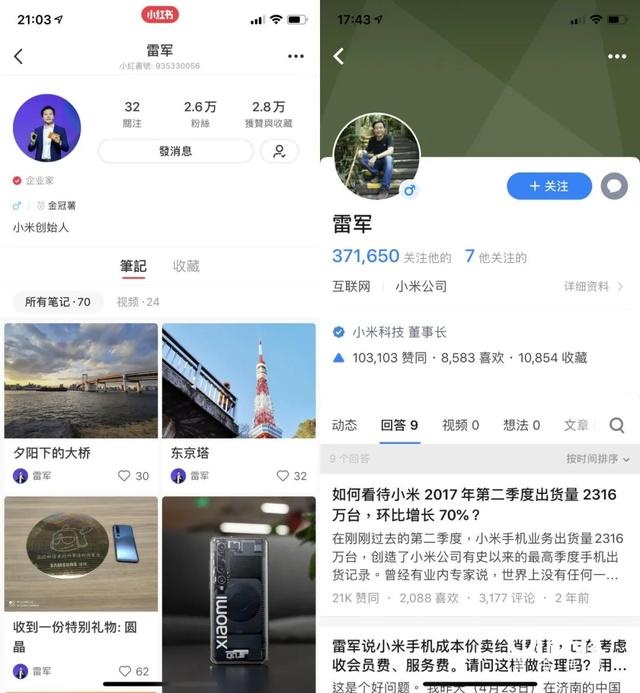 看起来,知乎上从事互联网、科技行业的人群更多,也更加喜欢讨论手机、互联网科技相关话题,更符合雷总和小米的调性,再说,雷总在知乎的粉丝比小红书多多了。