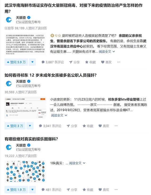 来看一下天眼查的机构号,天眼查在知乎上回答了800多个问题,其中最高赞的三个回答,都是与时事热点相关。