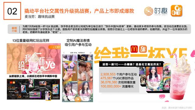 麦当劳在快手上的通过#给我一杯YE#挑战赛进行营销,亮点在于每天的挑战榜单都会进行更新,并通过社交式玩法,让参与挑战赛的人@一位好友进行传递。小椰杯最终获得了近300万用户参与、近50万UGC作品、3600万视频播放量、1亿+曝光量。