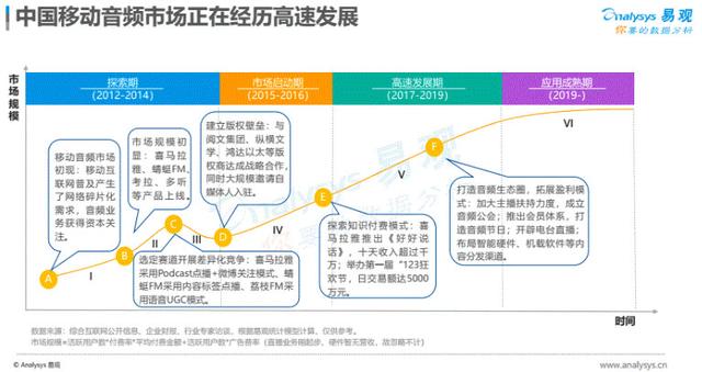 早前软硬件的优化,3/4G移动网络的成熟和使用成本降低,以及网络碎片化的需求,催发了2013年前后各类移动电台平台如雨后春笋般涌现,喜马拉雅亦为其中一员,处于初创期。