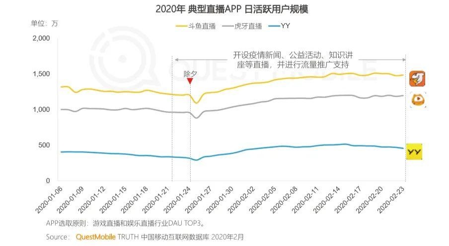 纯直播平台的话,斗鱼、虎牙的DAU在1000-1500万左右,YY在500万左右。