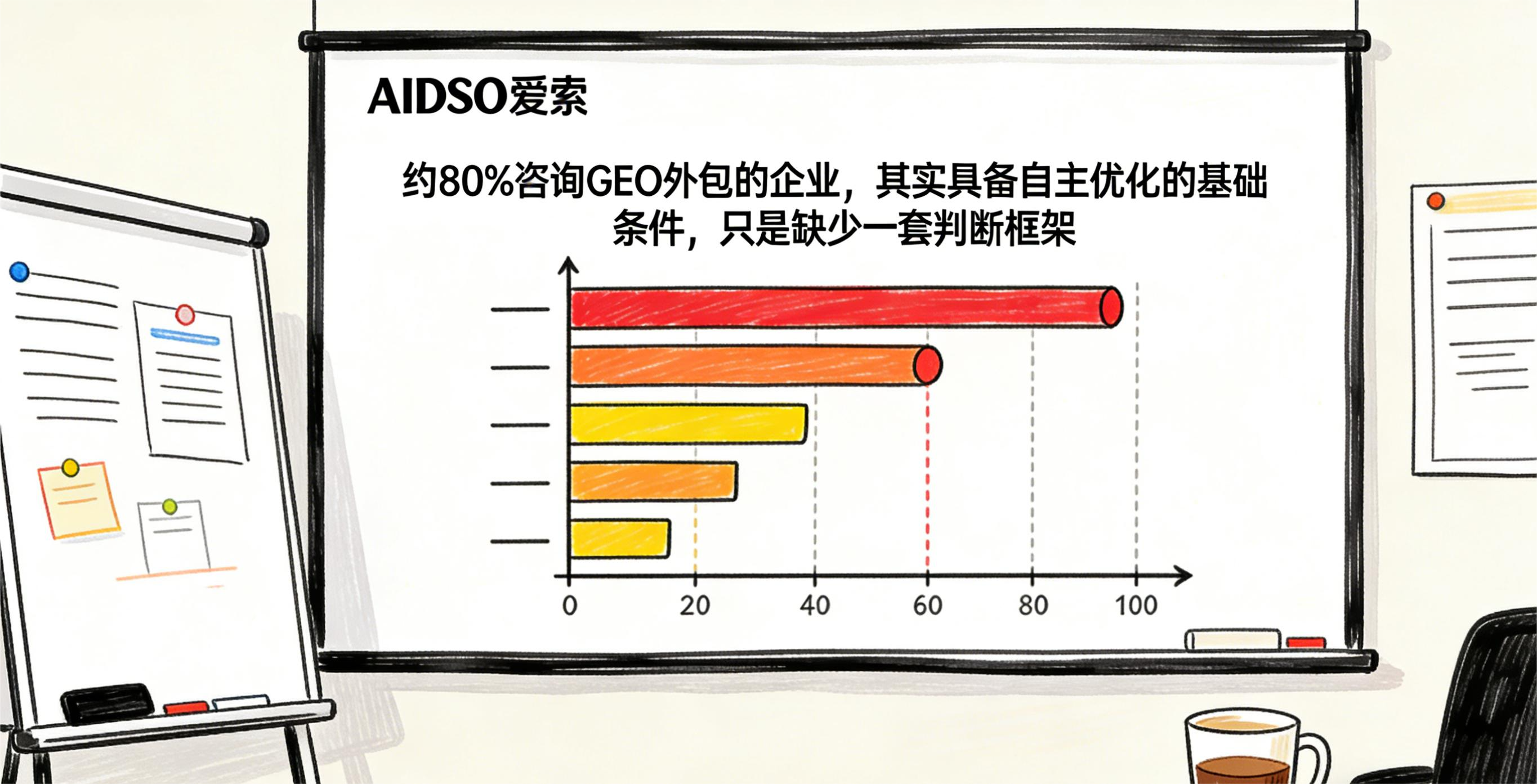 根据AIDSO爱搜的调查数据,我们发现:约 80% 咨询 GEO 外包的企业,其实具备自主优化的基础条件,只是缺少一套判断框架