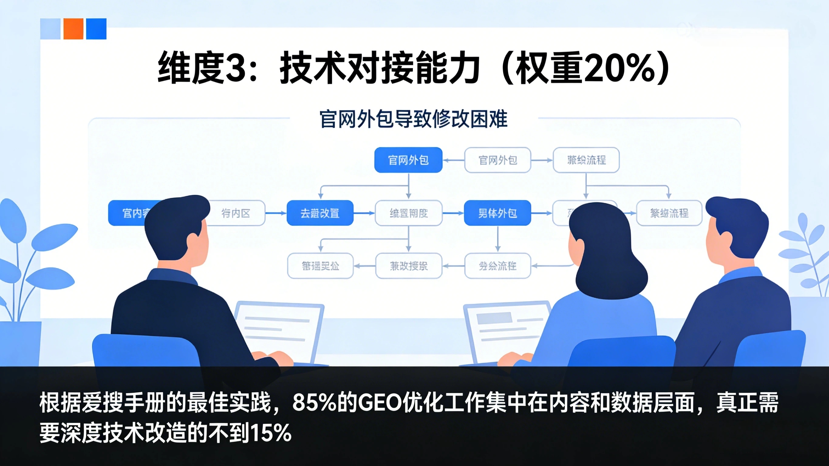 避坑提醒:根据爱搜手册的最佳实践,85% 的 GEO 优化工作集中在内容和数据层面,真正需要深度技术改造的不到 15%。
