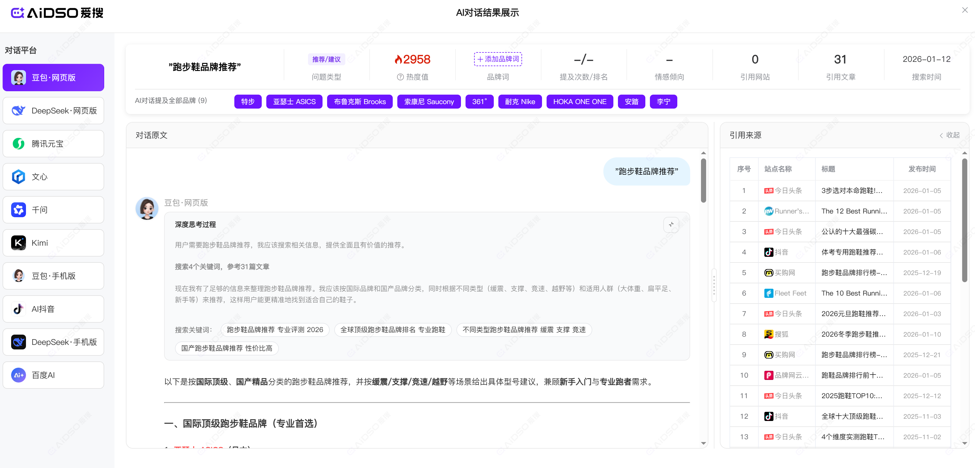 打开AIDSO爱搜平台(geo.AIDSO.com)输入你的目标用户可能会问的问题,比如:"跑步鞋品牌推荐"