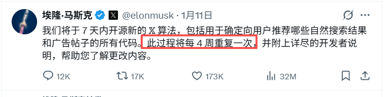 "我们将在7天内开源X平台的新算法,包括所有决定向用户推荐自然内容和广告内容的代码。这个流程每4周重复一次,并附上开发者说明。"