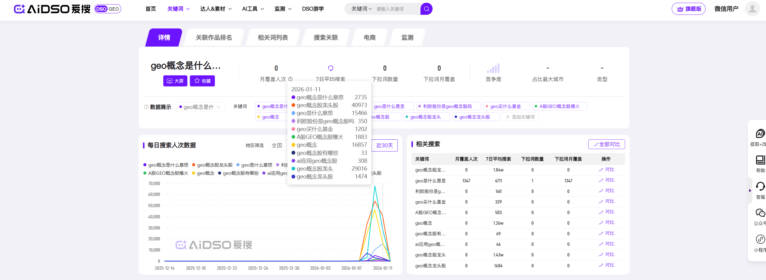 更魔幻的是,很多上市公司只要沾上"AI营销"四个字,资金就疯狂涌入。有投资者用AIDSO爱搜查询GEO概念股的AI搜索热度,发现从1月9日到11日,相关关键词的搜索量平均暴涨327%