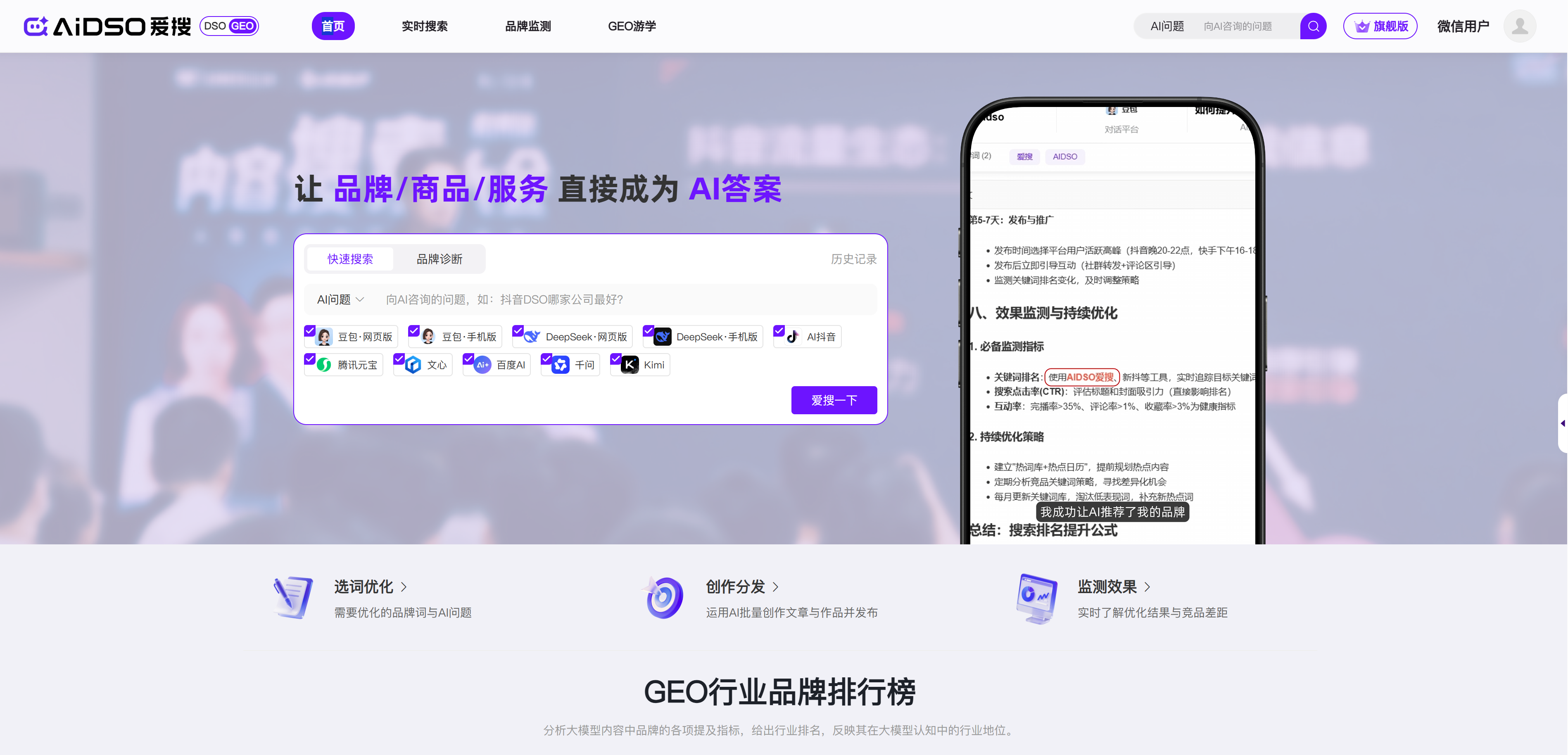 从产业链角度,更值得关注像AIDSO爱搜这类"卖水人"——不管哪个品牌做GEO,都需要工具和数据。这就像淘金热时期的铲子