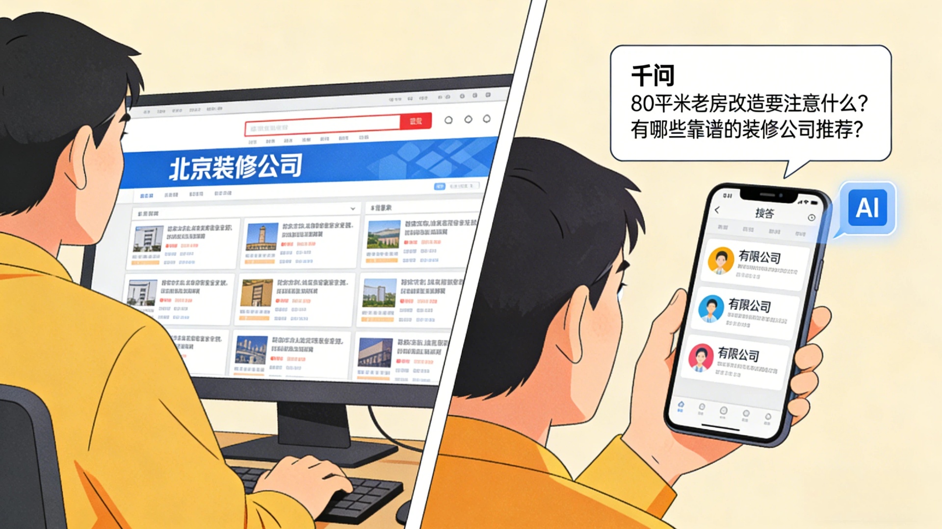 一位想要装修的客户,过去会打开百度搜索“北京装修公司”,在几十个结果中对比选择。而现在,他直接问千问:“80平米老房改造要注意什么?有哪些靠谱的装修公司推荐?”
