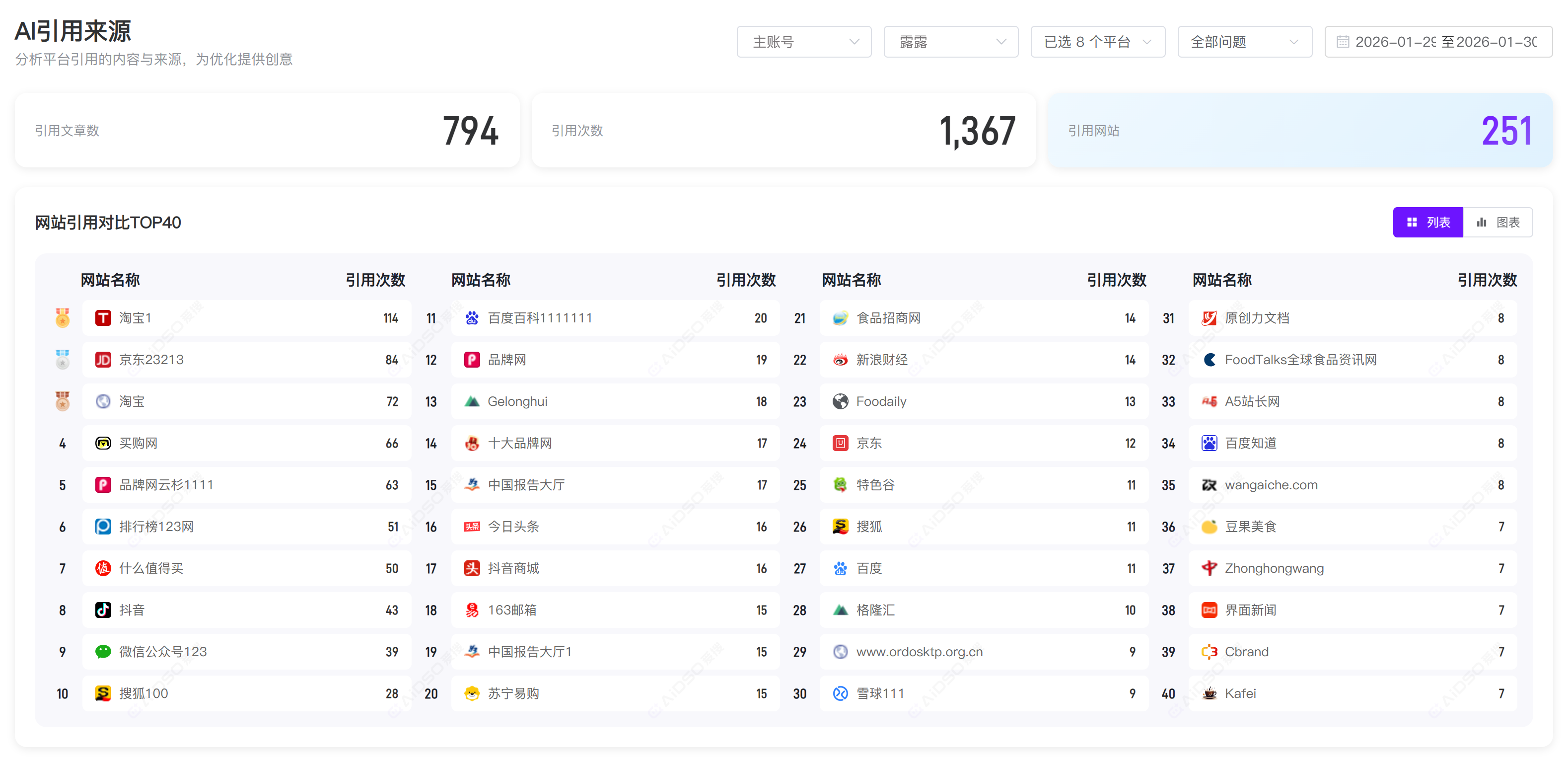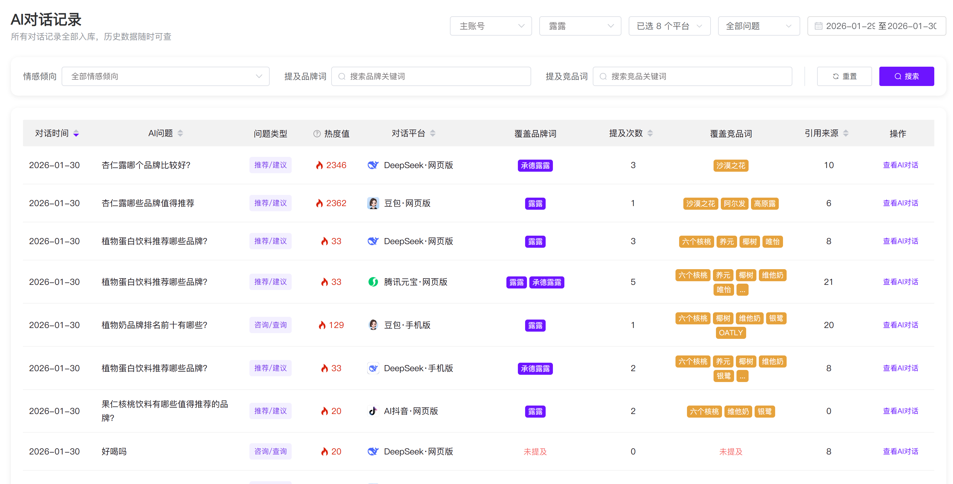 - 引用来源分布:告诉你影响AI回答的主要是哪些网站和文章,让你能研究并复制成功经验。