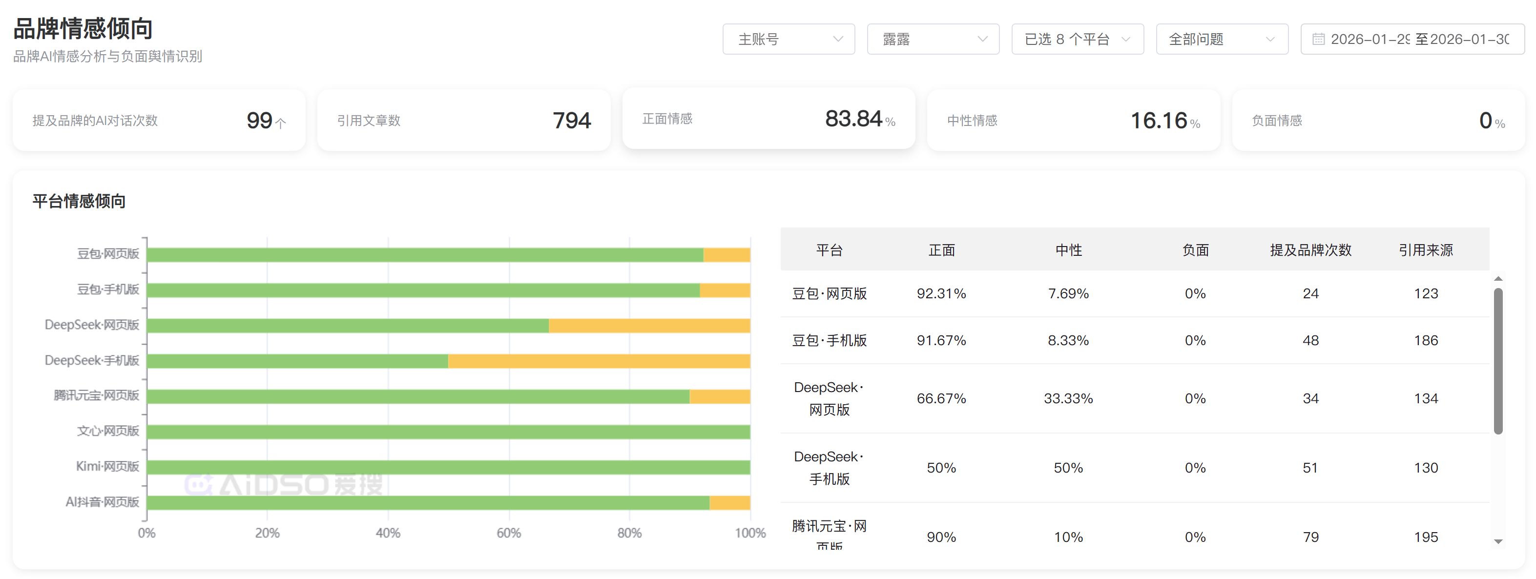 - 品牌情感分析:系统会自动分析AI对你品牌的评价是正面的、中性的还是负面的,帮你快速定位问题。