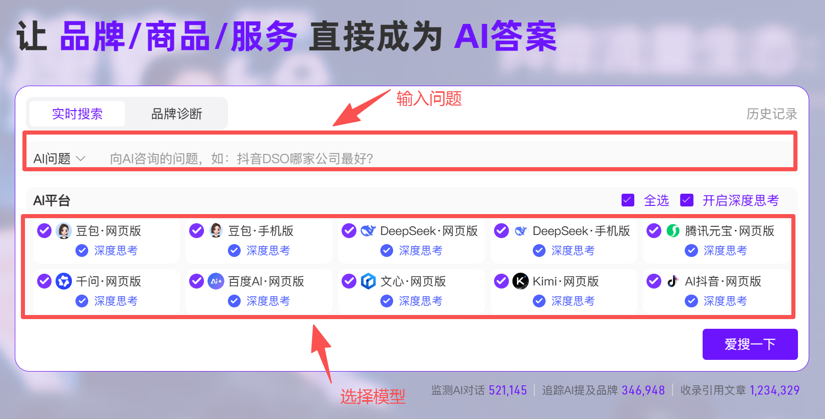 如何操作:在AIDSO爱搜平台输入一个你的潜在客户最可能问的问题,添加自己的品牌词和竞品词,然后选择主流的AI大模型进行搜索。