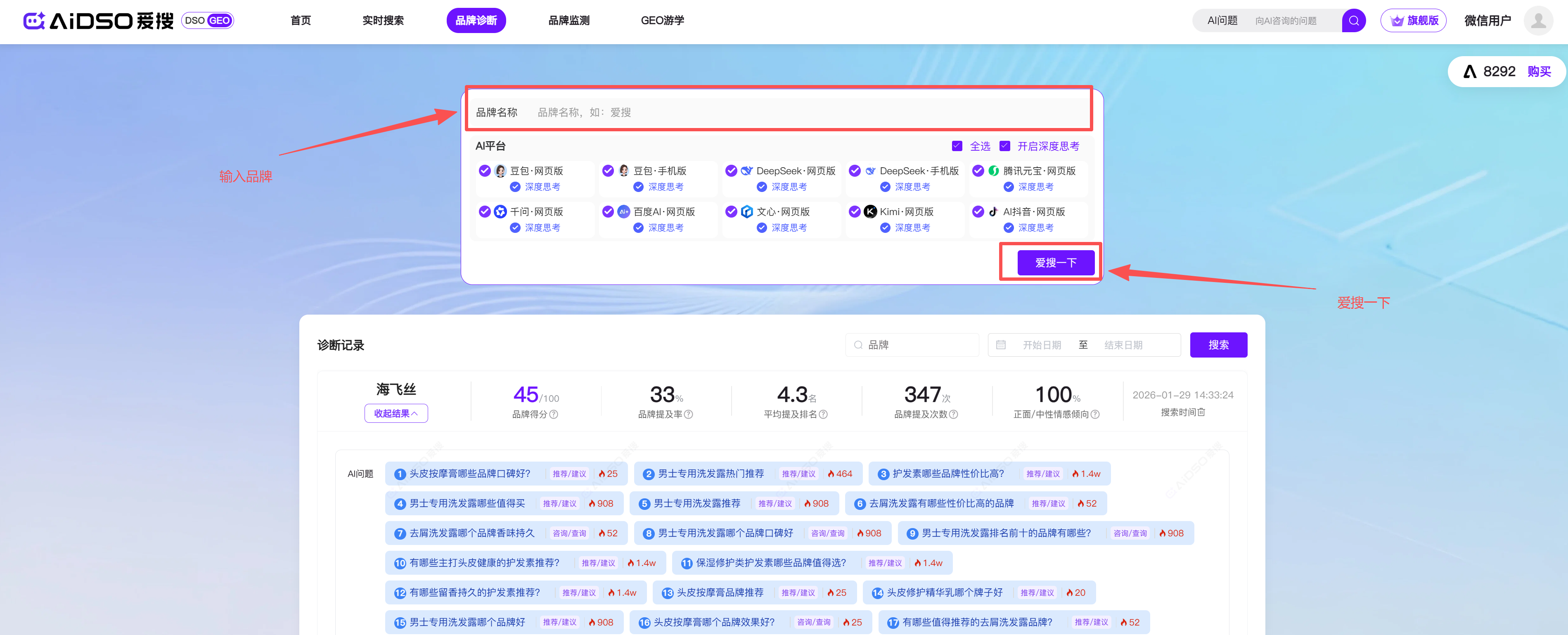 一次快速诊断是不够的。你需要对品牌进行一次全方位的“健康体检”。这就需要用到AIDSO爱搜的“品牌诊断”功能。它相当于一次性的品牌深度调研,会生成一份详细的分析报告。