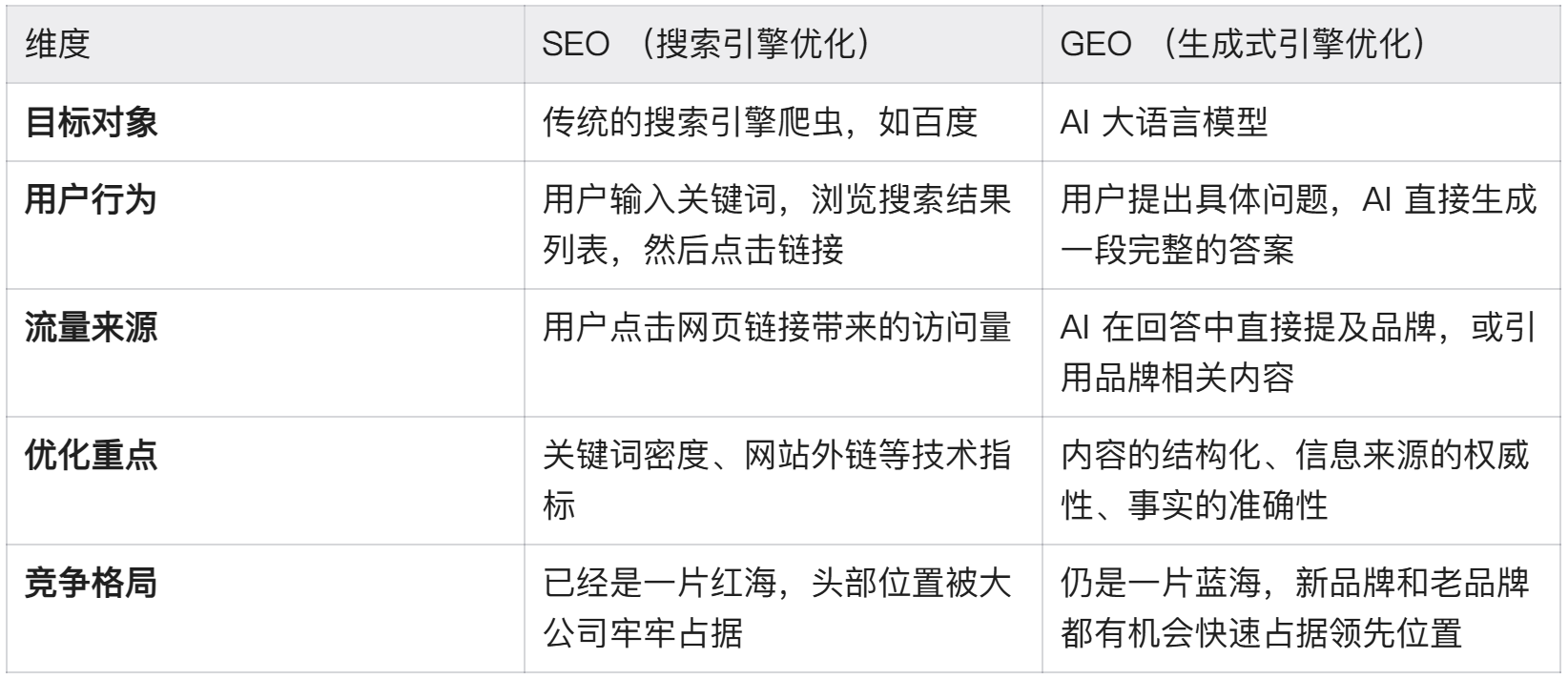 很多人熟悉SEO,但GEO是一个新领域。我们可以通过一个表格来清晰地看到它们的核心区别。