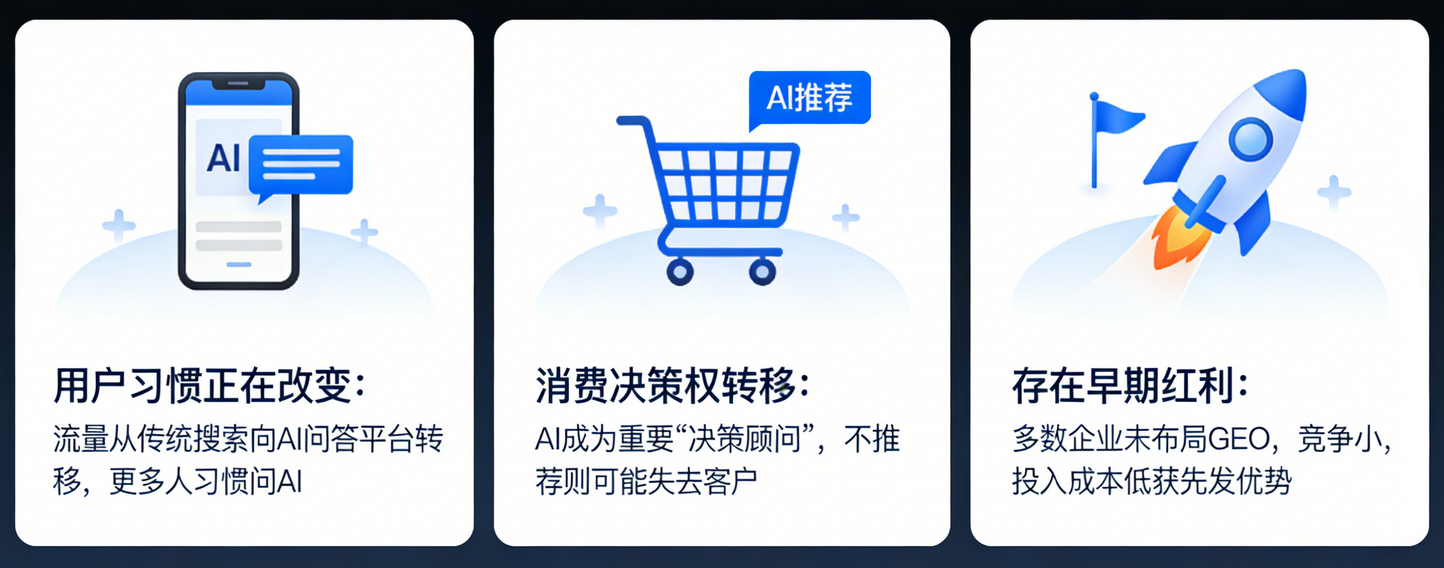 - 存在早期红利:目前,绝大多数企业还没有开始布局GEO。这意味着竞争相对较小。现在投入,可以用较小的成本获得巨大的先发优势。