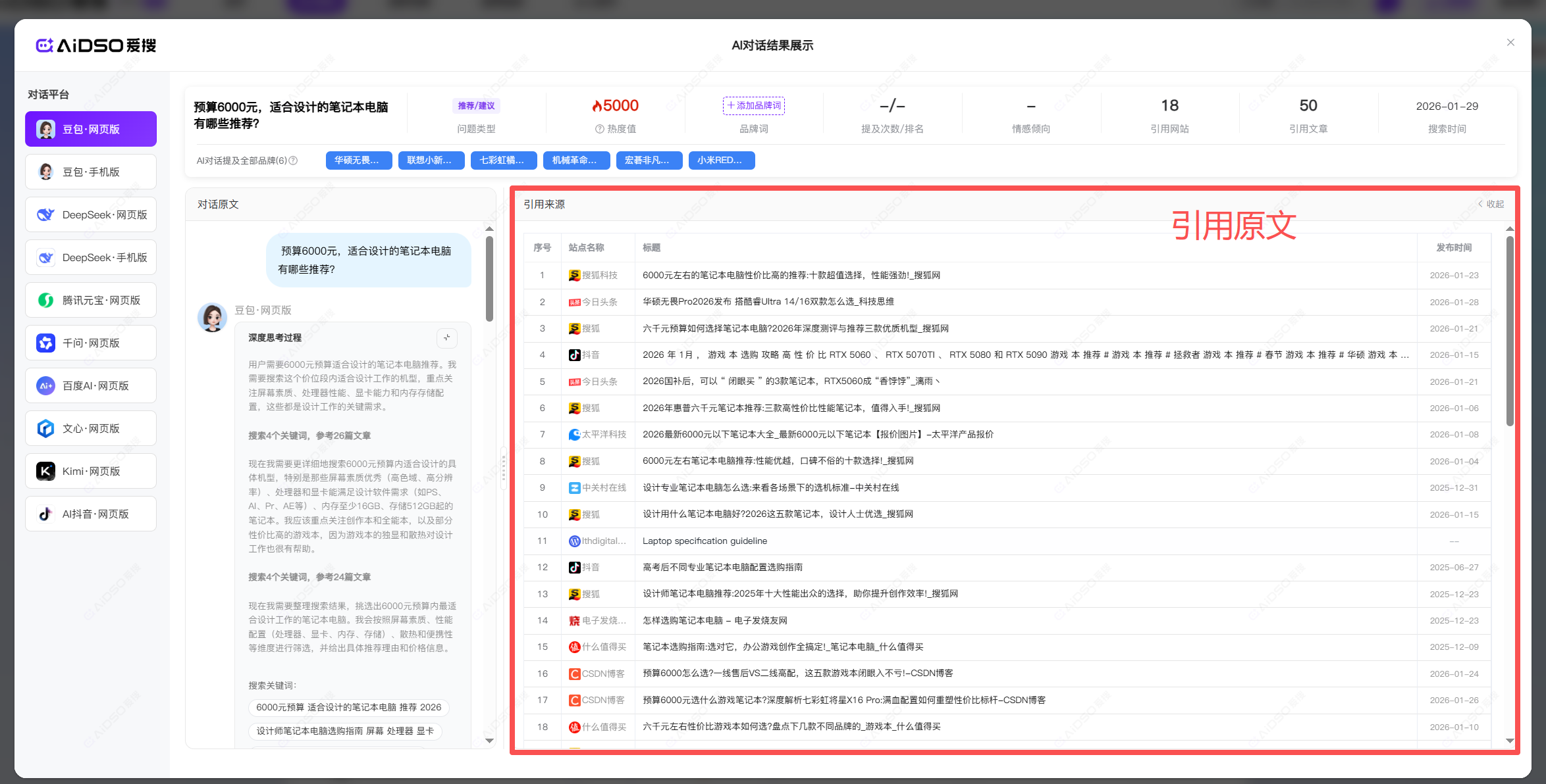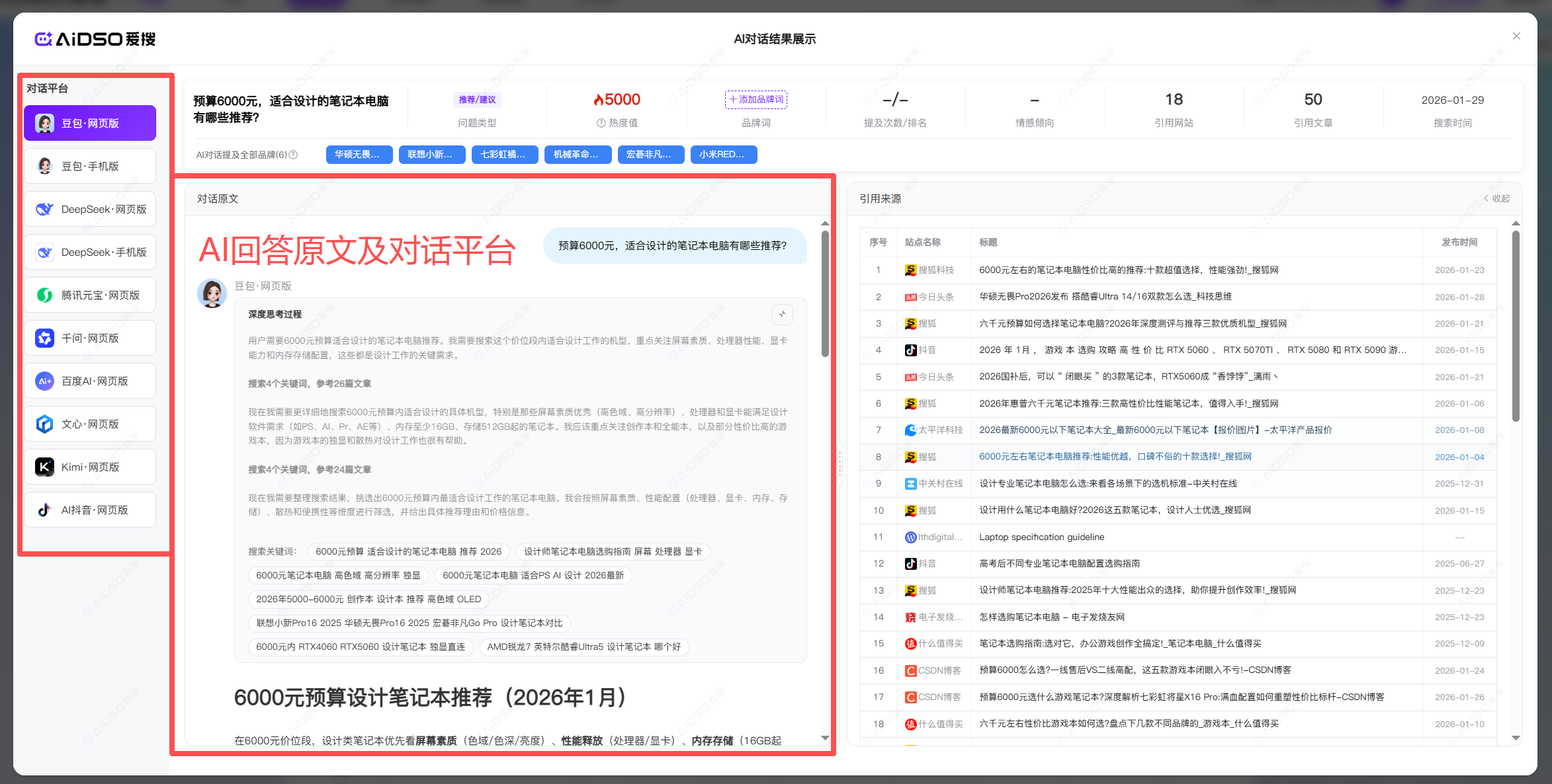- 左侧是AI回答区:10个AI的回答并列展示。如果你的品牌或竞品词被提及,会自动高亮,推荐情况一目了然。