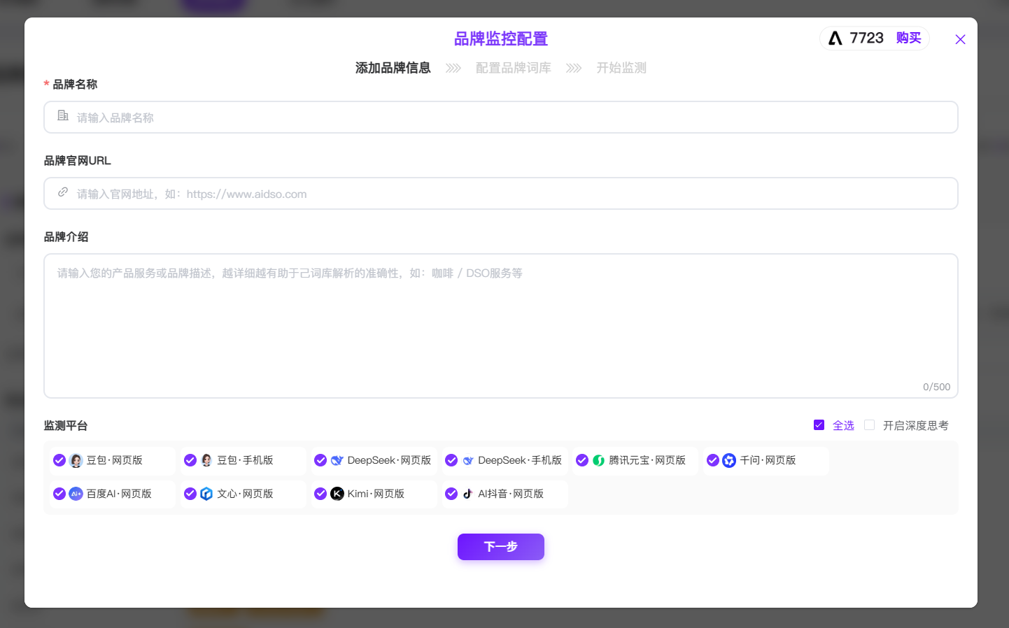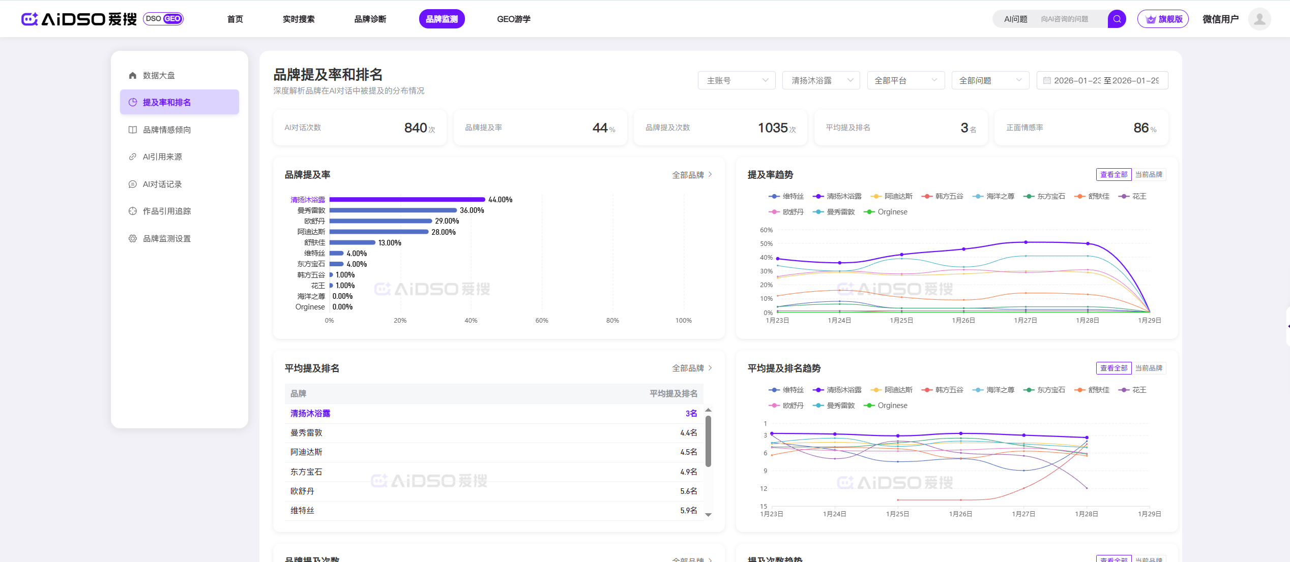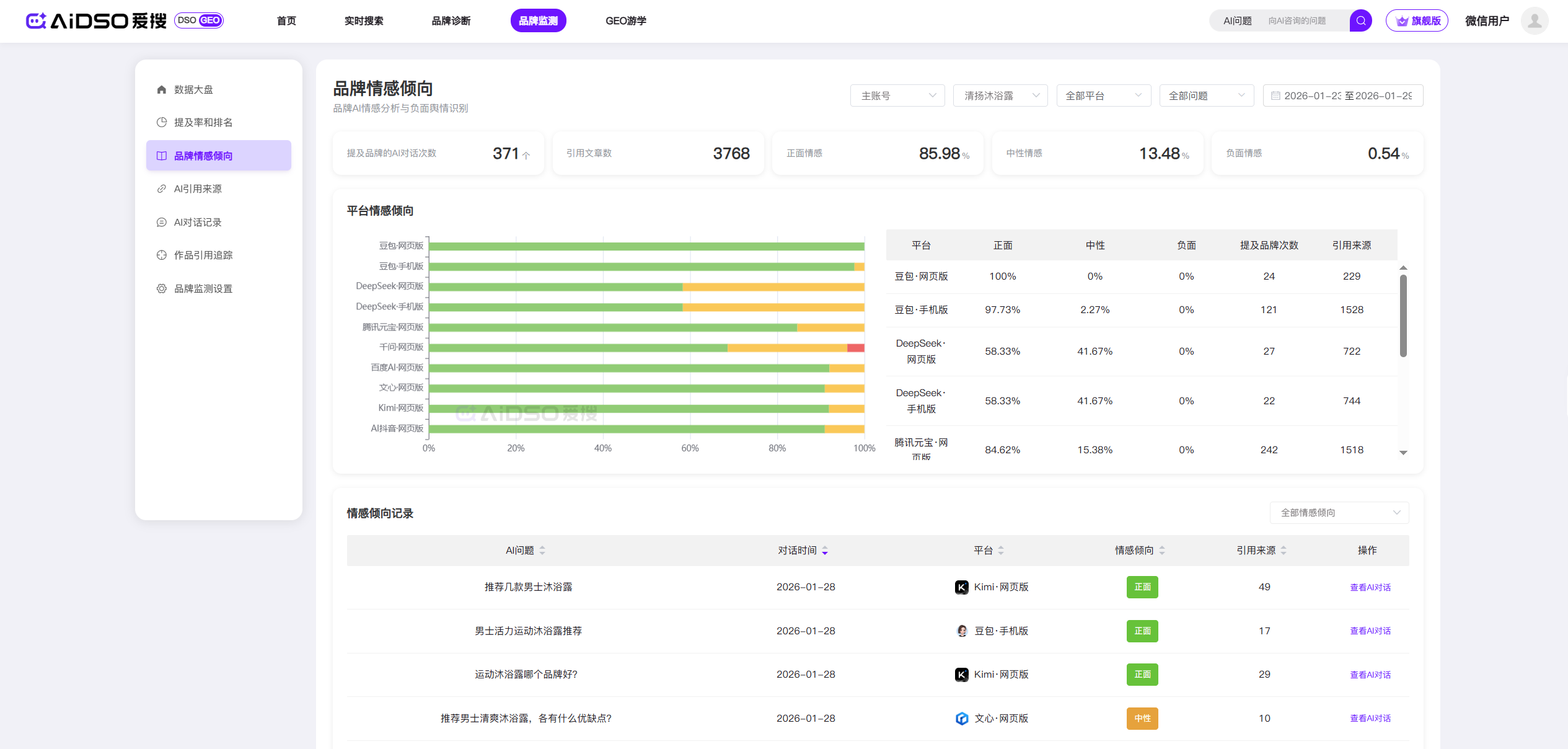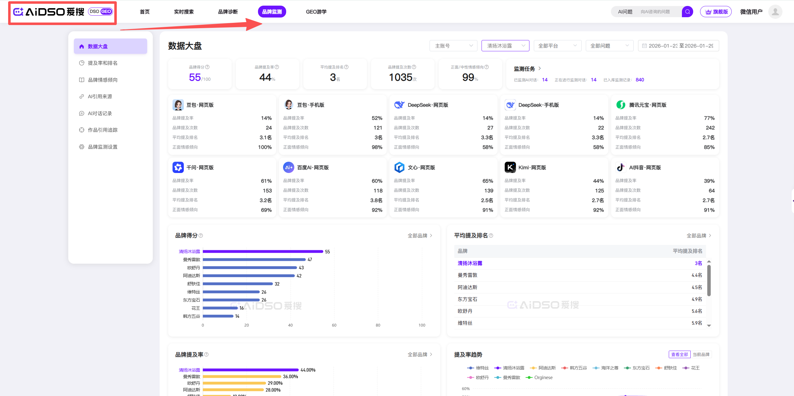 AIDSO爱搜的「品牌监测」功能,就是你品牌的“AI健康数据大盘”。