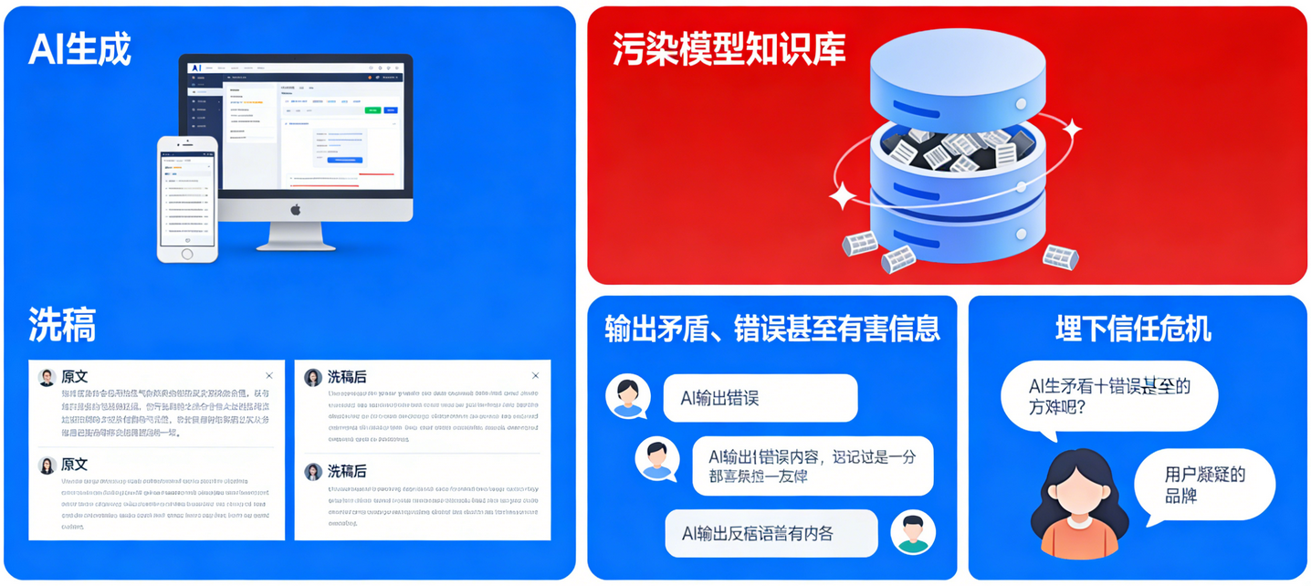 为快速产出内容,采用AI生成、洗稿等方式制造低质信息; 后果:这些信息垃圾会污染模型的知识库,导致AI在提及你的品牌时,输出矛盾、错误甚至有害的信息,埋下信任危机。