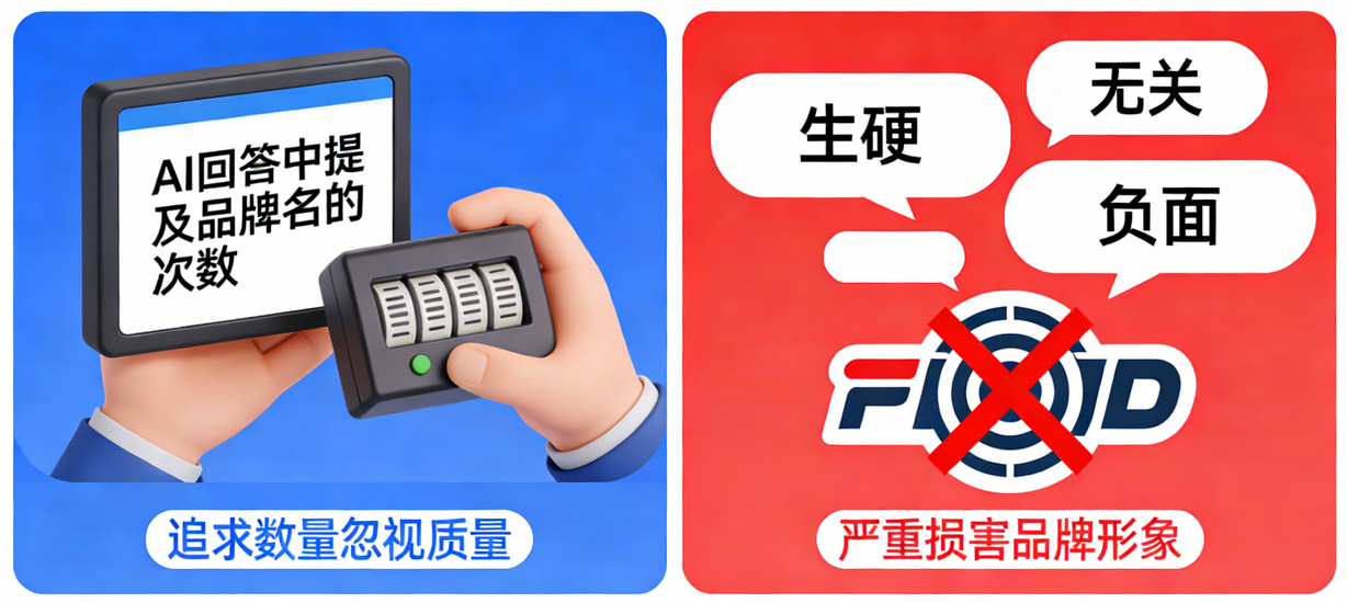 最普遍的误区,将GEO目标当成“AI回答中提及品牌名的次数”,追求数量而忽视质量; 后果:品牌获得生硬、无关甚至负面的曝光,严重损害品牌形象。
