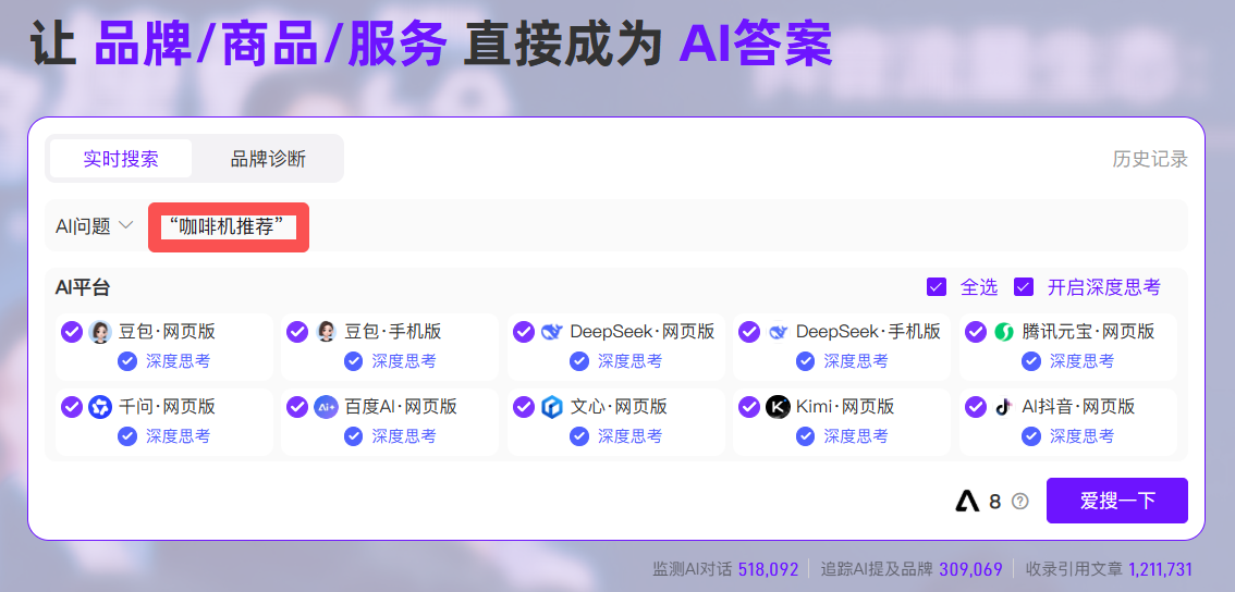 - 怎么看:在AIDSO爱搜的仪表盘中,设定好你的品牌名和核心业务关键词(如“咖啡机推荐”)AIDSO爱搜会自动追踪各大AI模型在回答相关问题时,你品牌被提及的次数