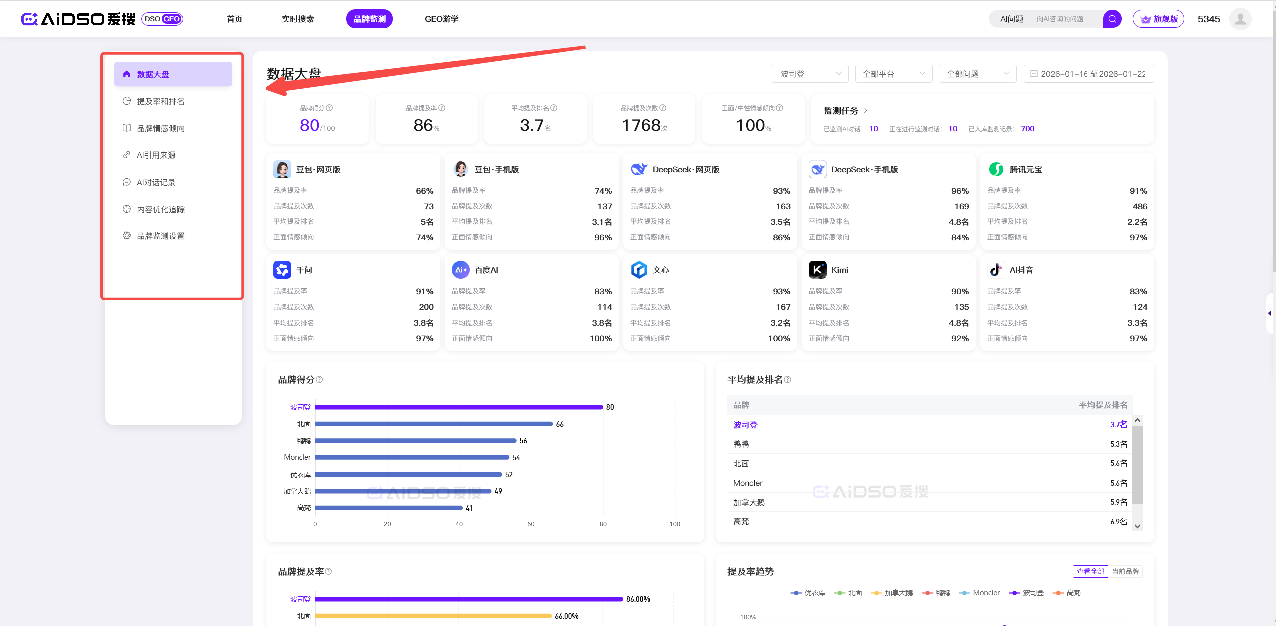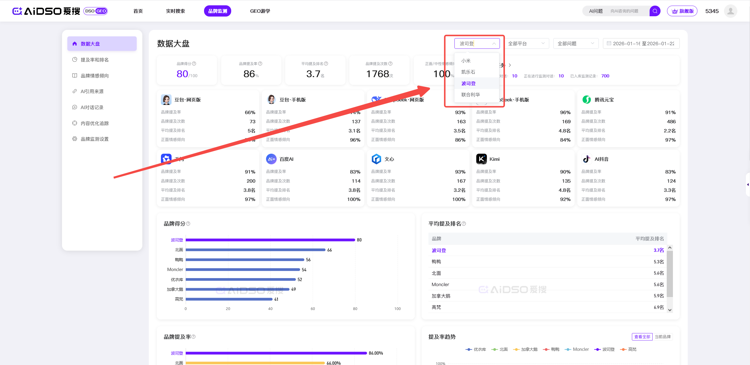 那就可以通过AIDSO爱搜品牌检测功能捕捉品牌提及率、正面评价等数据,对比竞品定位短板,搭配高权重平台布局、内容优化及情感分析,沉淀放大信任资产