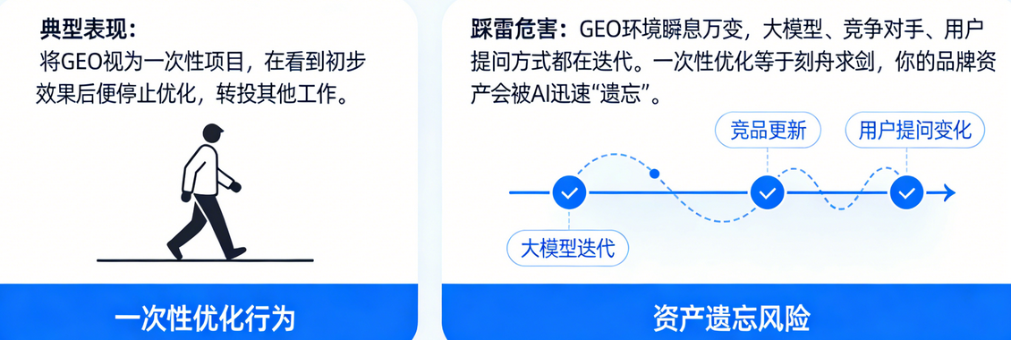 ⚠ 踩雷危害:GEO环境瞬息万变,大模型、竞争对手、用户提问方式都在迭代。一次性优化等于刻舟求剑,你的品牌资产会被AI迅速“遗忘”。
