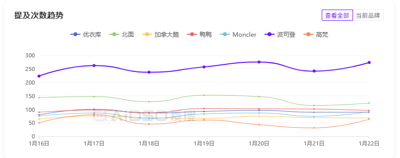 - 对比核心指标: 清晰看到品牌在哪个平台的“提及率”最高、“品牌得分”领先。
