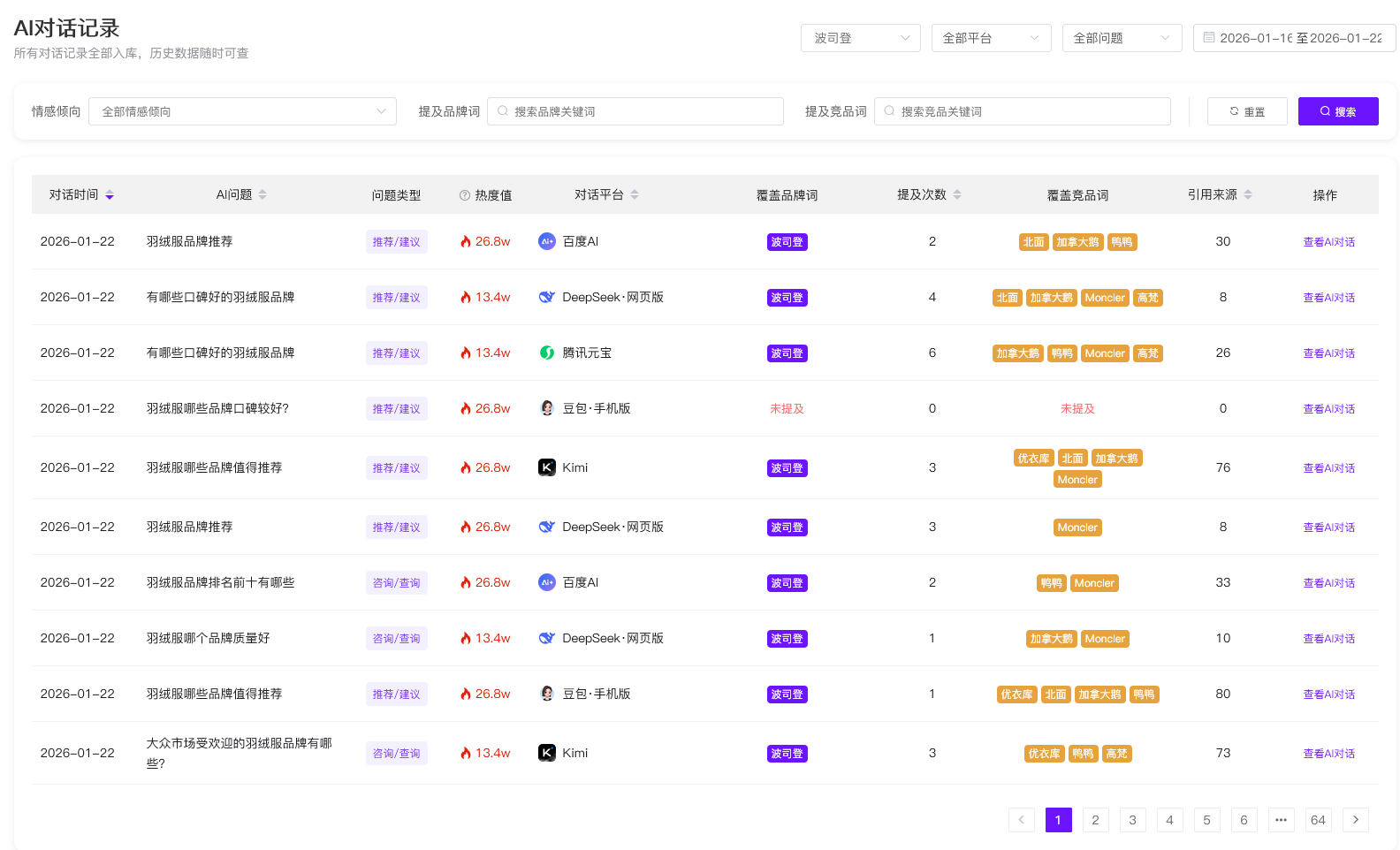 - 发布后“监控”: 开启品牌监测,关注“品牌感情分析”趋势图。一旦发现负面提及率飙升,可立即追溯“AI对话记录”找到问题根源,及时应对。
