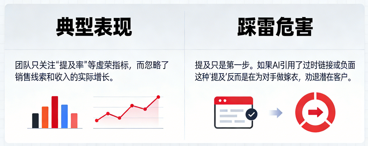 ⚠ 踩雷危害提及只是第一步。如果AI引用了过时链接或负面评测,这种“提及”反而是在为对手做嫁衣,劝退潜在客户。