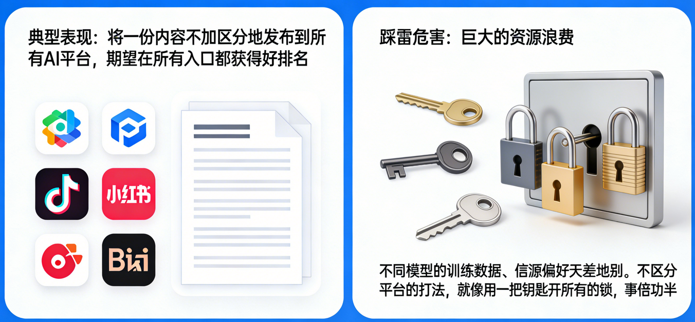 ⚠ 踩雷危害:巨大的资源浪费。不同模型的训练数据、信源偏好天差地别。不区分平台的打法,就像用一把钥匙开所有的锁,事倍功半。