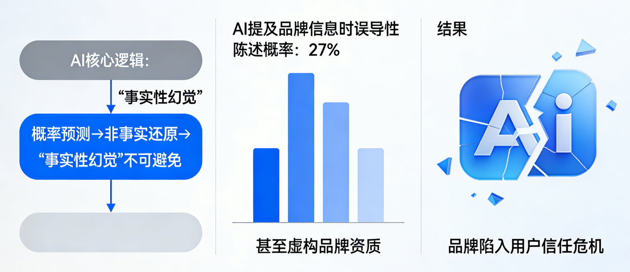 AI的核心逻辑是概率预测,而非事实还原,这就决定了“事实性幻觉”的不可避免——而这,正是GEO优化最隐蔽的致命危害。研究显示,AI在提及品牌信息时,产生误导性陈述的概率高达27%甚至虚构品牌资质。一旦传播开来,品牌很容易陷入用户信任危机