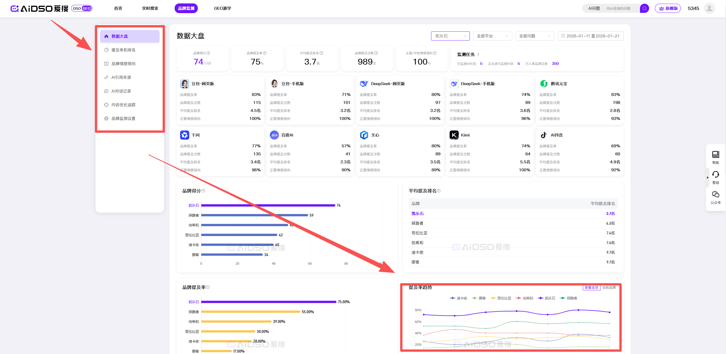 GEO优化是系统工程,需长期追踪。AIDSO爱搜的品牌监测功能,可实时捕捉品牌提及率、排名波动、引用源变化,生成趋势图表,守住流量主权。