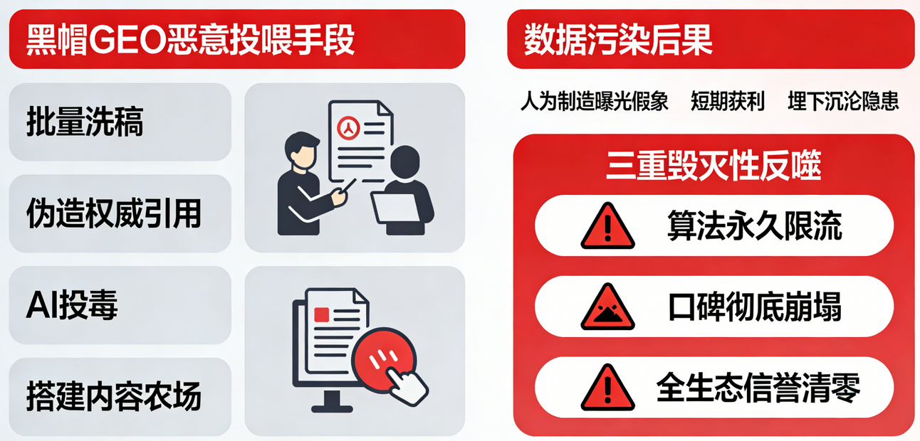 急功近利下,黑帽GEO恶意投喂已成最常见的高危操作——通过批量洗稿、伪造权威引用、AI投毒、搭建内容农场等“数据污染”手段,人为制造曝光假象,短期获利却埋下沉沦隐患。