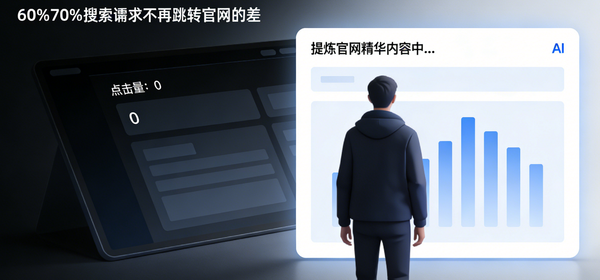 这是GEO优化最直接的危害——AI将你的官网精华、干货内容提炼成短句,用户在对话框里就能获取答案,根本无需点击进入你的页面。这种“答案即服务”的模式,让60%-70%的搜索请求彻底丧失跳转行为