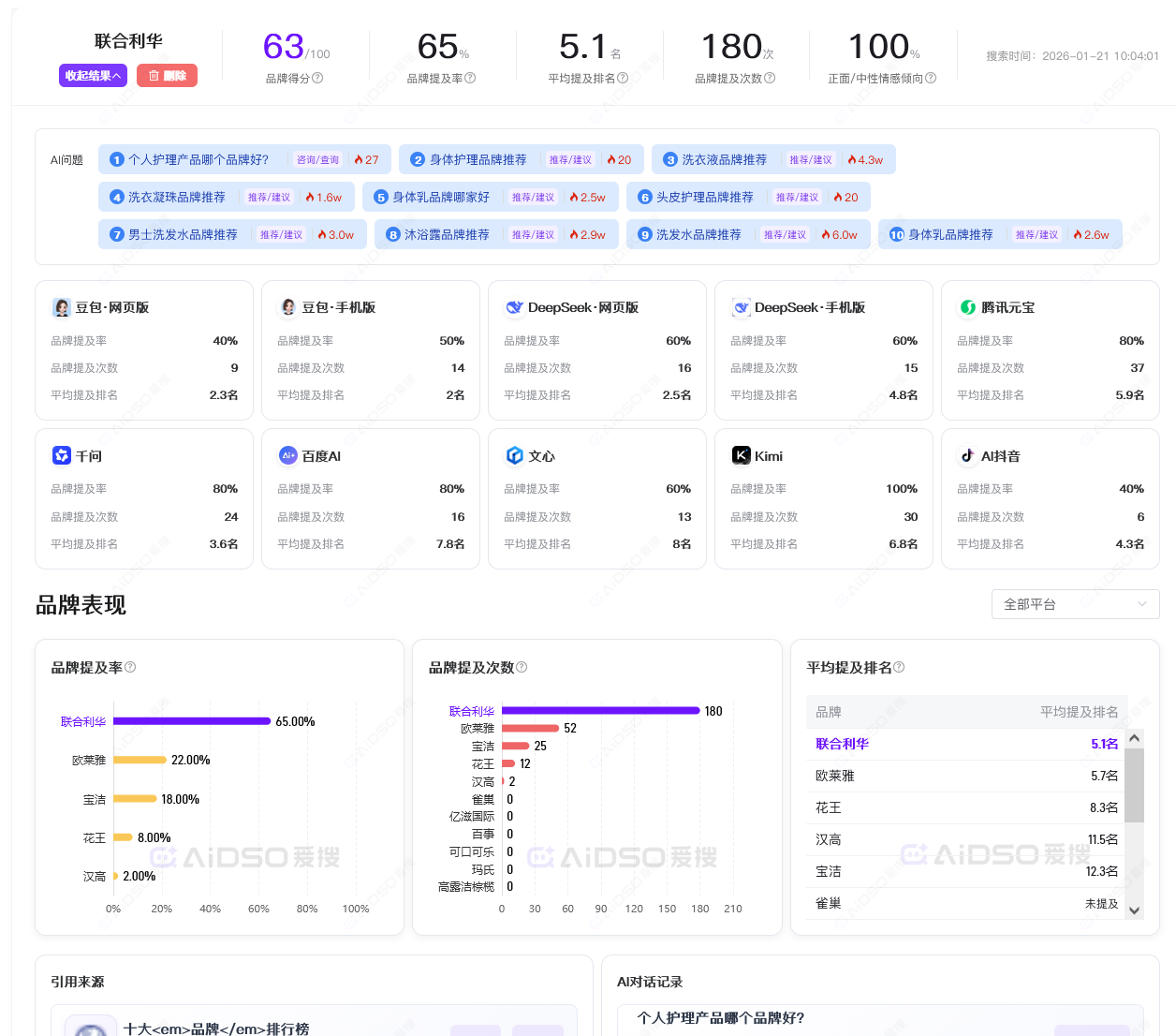 想第一时间发现AI幻觉、规避风险?AIDSO爱搜的实时搜索功能,可模拟真实用户向豆包、DeepSeek、Kimi、腾讯元宝等10大主流AI平台提问,同步呈现品牌被提及次数、排名位置、引用来源,甚至AI对品牌的“情感倾向”(正向/中性/负向)。一旦发现错误信息,能快速定位引用源并修正
