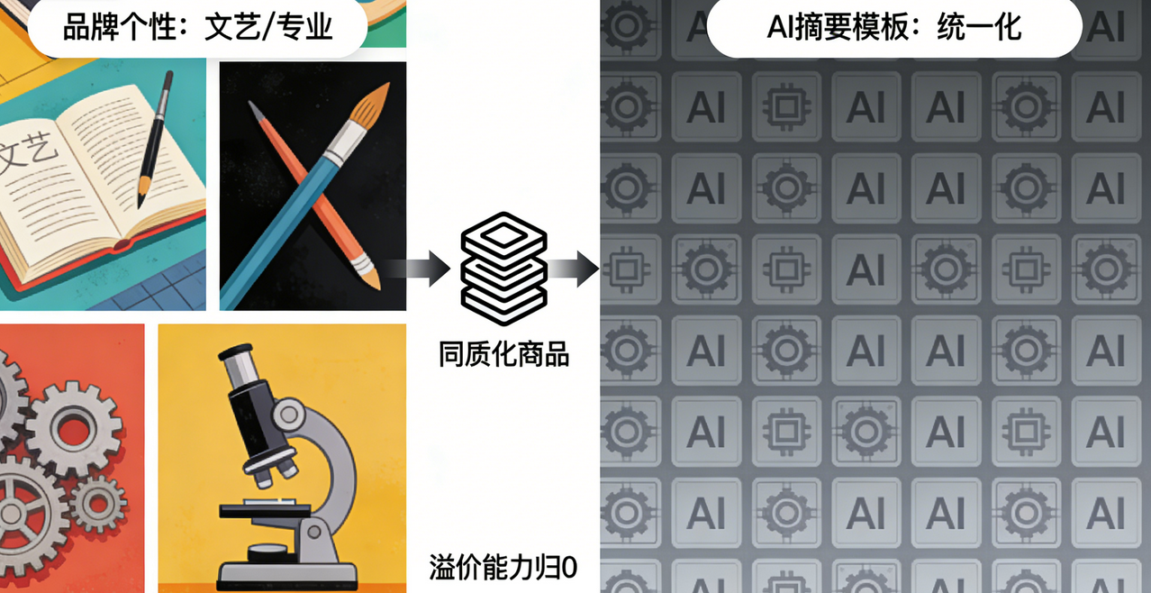 为了迎合AI抓取偏好,很多品牌被迫抛弃自身风格,你花费十年、二十年建立的品牌调性,无论是文艺质感还是专业锋芒,在AI摘要中都会被磨成统一模板,和竞争对手毫无区别。最终你的产品就会沦为“同质化商品”,原本的品牌溢价能力也会随之消失。