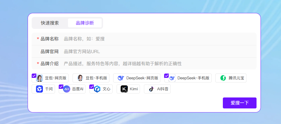 GEO是一场关乎生存的新战争。如果你不确定自己的品牌在AI眼里的“体检分数”,可以尝试使用AIDSO爱搜提供的“快速搜索”与“品牌诊断”功能,实时看清品牌在各大大模型中的曝光现状。